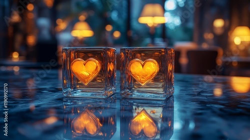 Glass Cubes with Heart Design Illuminated by Warm Light. Generative AI