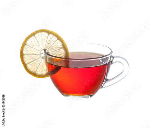 Glass cup of tea on white background