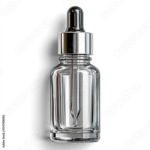 Glass dropper bottle with a shiny silver cap, designed for storing liquids, often used for essential oils or skincare products.