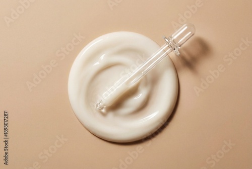 Glass dropper in circular swirl of viscous white moisturizer cream