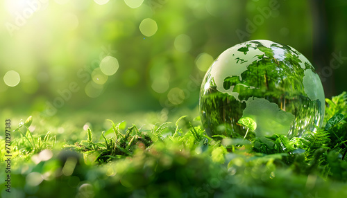 Glass globe world map encircled by verdant forest flora, symbolizing nature, environment, ESG, green energy, sustainable industry, circular economy and renewable energy, climate change awareness.