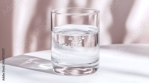 Glass of clear water placed on white table with shadow, captured with 50mm lens natural daylight soft reflection