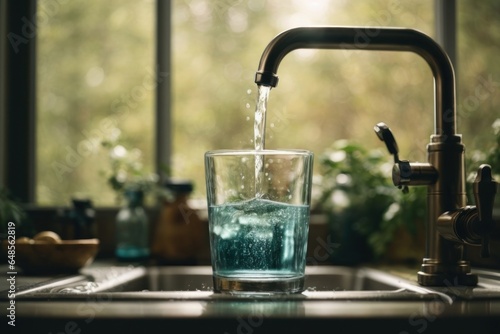 "Glass of Crystal Clear Water Directly from Faucet, Plants in the Background