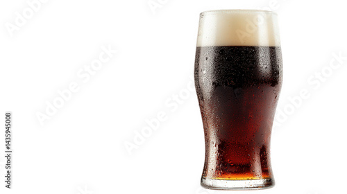 glass of dark. bubbly beverage with a frothy head. showcasing condensation on the outside. indicating it is cold and refreshing this drink is often enjoyed in social settings or as a part of leisure a