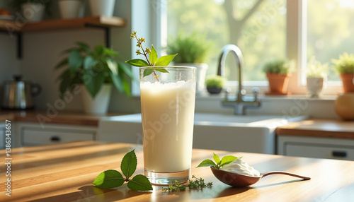 Glass of homemade kefir with spoonful of yogurt and fresh herbs on wooden kitchen counter with bright morning light for a refreshing probiotic-rich scene