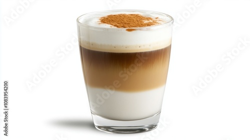 Glass of iced coffee with a creamy milk foam topping, isolated on a white background