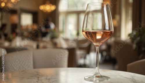 Glass of rose wine on table in restaurant interior. Soft focus background shows elegant dining setting with blurred people and decor. Perfect for lifestyle, celebration, or romantic date themes.
