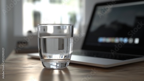 Glass of Water on Wooden Desk with Blurred Laptop Background