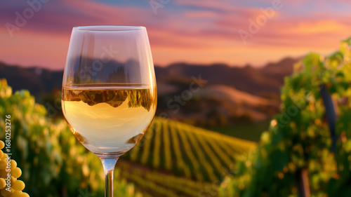 Glass of wine in a vineyard at sunset, embodying tasting culture terroir and the relaxed celebration of craftsmanship agriculture and place.