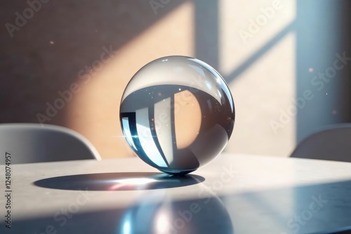 Glass orb suspended in mid-air on a minimalist table, shadows, reflective surface, ambient light