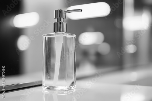 Glass perfume bottle with pump dispenser, elegant design, transparent liquid. Beauty product on countertop in room with blurred background.