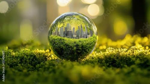 Glass sphere reflecting city buildings on a bed of moss.