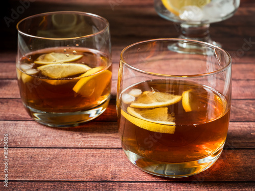 Glasses of cocktail with ice and lemon on wooden table close-up