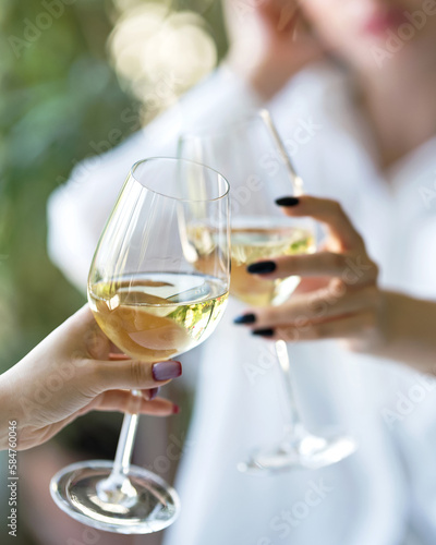 Glasses of white wine in hands of women. Two women drink white wine. Cheers, clinking of glasses. Holiday celebration. Meeting and chatting with friends. Front view. Soft focus. Close-up.