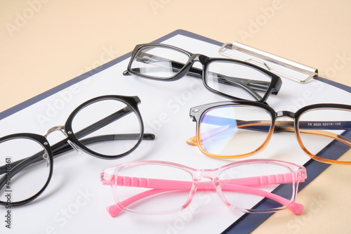 glasses on a clipboard, beige background, diagnostics of vision