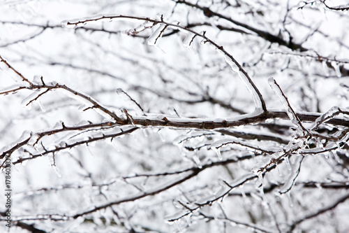 Glazed tree branch after winter ice storm, snow and frozen rain, icicles