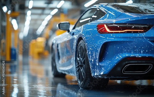 Gleaming Blue: A luxury sports car, freshly soaped, awaits its final rinse. The car wash's sleek floor reflects the vibrant blue.