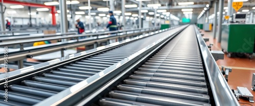 Gleaming empty conveyor belt, modern factory automation system, assembly, details