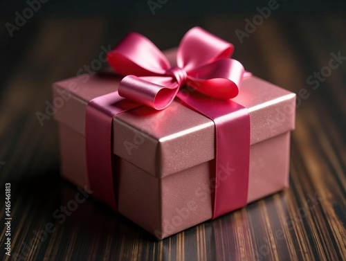 Gleaming giftbox with luxurious satin bows on dark wood , gift box mockup, wrapping