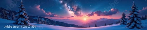 Glimmering stars and shooting star over snowy Christmas landscape, graphic, festive