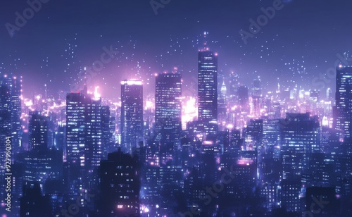 Glimmering Urban Enchantment: anime-style Illustration of a Cityscape Aglow with the Magic of Metropolis Nights, Ideal for Skyline Postcards,Anime-Style,illustration,Picture BooksFor Poster,Novel,UI,W