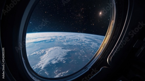 Glimpse of Earth from a spacecraft window, revealing swirling clouds beneath and a starry sky above. This breathtaking view captures the beauty of our planet in space