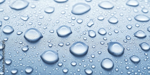 Glistening Water Droplets on Vibrant Blue Surface, Reflecting Light and Elegance