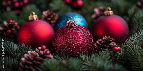Glittering Christmas ornaments among pine branches and cones.