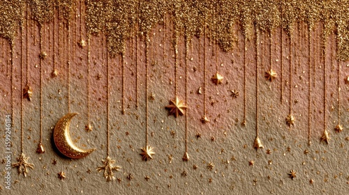 glittering, gold, star, moon, hanging, drip, texture, background, pastel, design, art, decorative, sky, night, space, cosmic, abstract, graphic, pattern, element, metallic, decoration, cosmos, visual, composition, creative, luxury, elegant, soft, beige, rose, glistering, shiny, drip, paper, artistic, unique, modern, image, wall