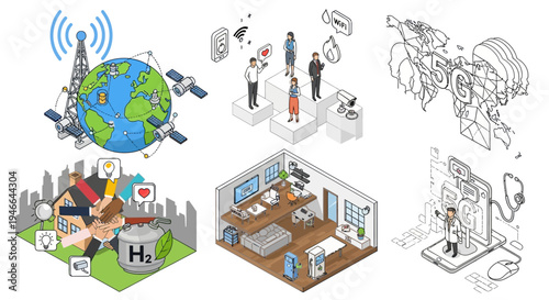 Global Business Network and Communication Isometric Vector Illustration World Technology Connection Concept