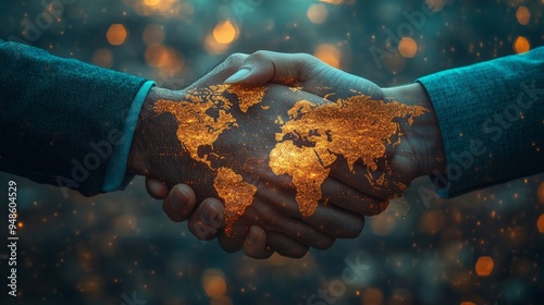 Global Business Partnership: Two hands clasp in a firm handshake, a luminous world map superimposed, symbolizing international cooperation and the power of global alliances.