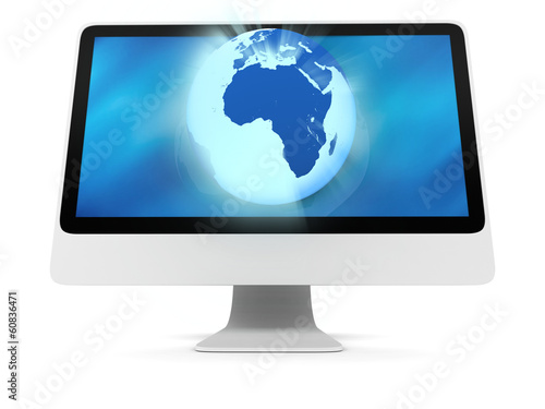 blue, computer, connecting, connection, desktop, display, earth, global, globe, glowing, illustration, cyberspace, isolated, monitor, network, planet, screen, sphere, technology, web, white background, earth