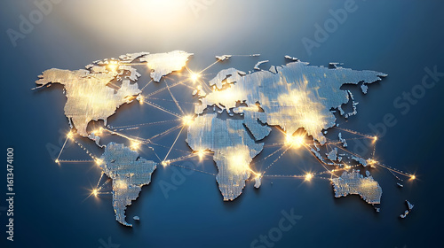 Global interconnectedness, a detailed world map with glowing connections. International communication and trade are symbolized with numerous points of light linking continents across the globe