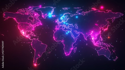 earth, map, global, network, connection, technology, digital, cyberspace, communication, globalisation, neon, light, glowing, pink, purple, blue, abstract, futuristic, modern, graphic, design, illustration, datum, line, point, node, cosmos, universe, space, electric, energy, bright, high-coloured, colours, dynamic, vibrant, illuminated, interconnected, worldwide, planet, earth