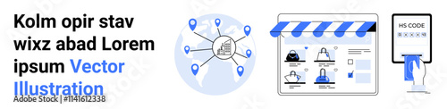 Globe with location markers connected to online shop interface displaying various products and services with secure payment processing options. Ideal for e-commerce, global reach, digital marketing