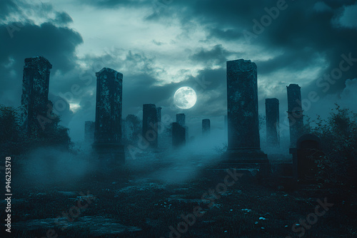 Gloomy night cemetery, stone monument. Sky with clouds, fog. Dramatic scene for Halloween background. 3D Rendering
