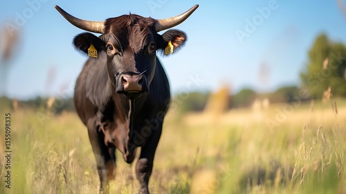 Glorious brown cow standing with pride in a sunlit green pasture against a clear blue sky : Generative AI