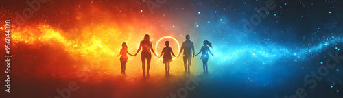 Glossy Abstract Family Circle with Glowing Unity Lines concept as A dynamic digital art banner featuring an abstract interracial family forming a circle with glowing lines of unity connecting them. Th