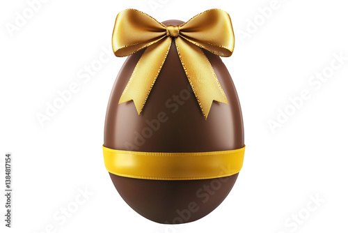 Glossy chocolate Easter egg tied with yellow ribbon in bow, isolated on white transparent background. Festive and sweet holiday celebration concept