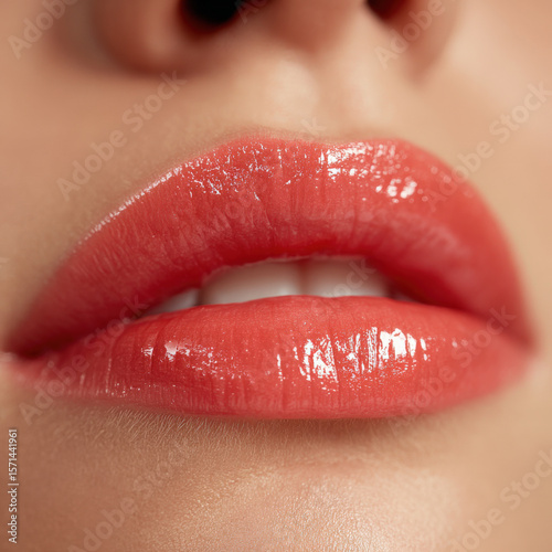 Glossy coral lips with sheer finish, showcasing vibrant and fresh look. close up highlights smooth texture and shine, evoking sense of beauty and allure