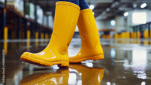 glossy, yellow, footwear, indoor, stylish, hard-wearing, comfortable, fashion, protection, waterproof, casual clothes, utility, shoe, rainy day, colours, landscape, interior, equipment, safety, maintenance, seasonal, work, activity, lifestyle, nature, industry, modern, warehouse, ergonomic, visibility, functionality, generative, ai