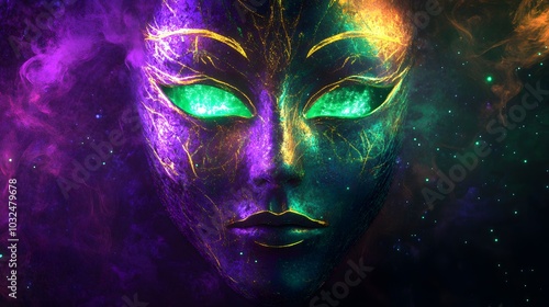 Glowing beams of emerald and royal purple light softly illuminating the edges of a mystical mask