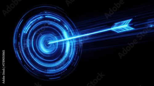 arrow, target, blue, glowing, neon, digital, abstract, technology, futuristic, speed, motion, light, dark, black, concentric, circle, interface, concept, precision, accuracy, goal, success, achievement, sharpened, trajectory, energy, cyberspace, virtual, graphic, illustration, design, modern, dynamic, streak, beam, datum, connection, network, breakthrough, innovation