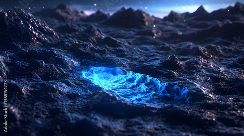 landscape, rock, blue, crevice, dark, glowing, night, texture, surface, mountainous, rough, deep, fantasy, mysterious, enigmatic, cosmic, space, celestial, alien, digital, art, abstract, illustration, three-dimensional, render, science, fiction, dreamlike, surreal, unearthly, whimsical, magical, vibrant, aglow, radiant, phosphorescent, obscure, hidden, shadowy
