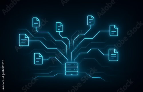 Glowing blue document icons connected through digital network lines to a central server, representing data flow and file synchronization.