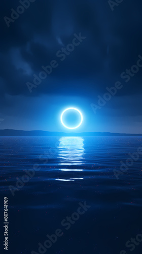 ocean, glowing, blue, neon, ring, horizon, water surface, calm, stage, booth, display, advertising, product, business, shooting, e-business, publicity, marketing, promotion, empty, poster, art, decoration, copy space, background, illustration, theme