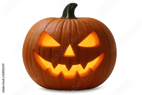 Glowing carved jack-o'-lantern revealing sinister facial expression, casting eerie halloween mood against transparent backdrop