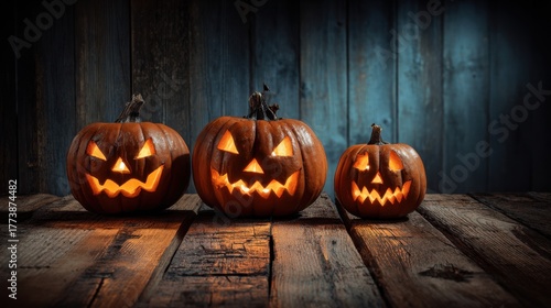 halloween, pumpkin, carved, glowing, skittish, light, orange, wood, rustic, dark, night, autumn, fall, festive, decoration, tradition, celebration, holiday, candle, warm, face, smile, eye, mouth, seasonal, old, vintage, distressed, party, october, harvest, illuminated, lantern, atmosphere, creepy, scarey, eerie, evil, three, table, mystical, mystery, ancient