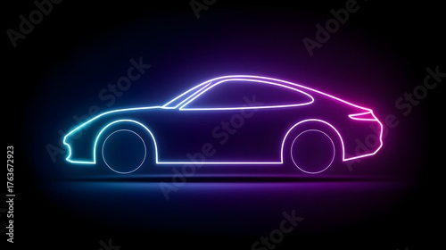 Glowing contour of a modern coupe illuminates a dark background with vibrant neon colors