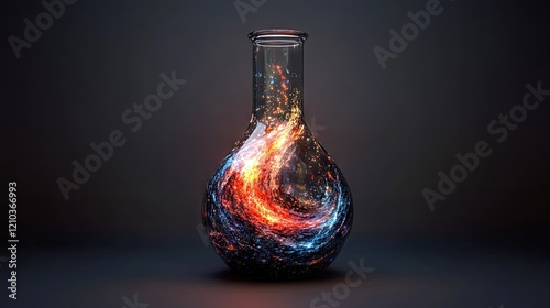 Glowing cosmic swirling inside glass flask, dark background, science concept
